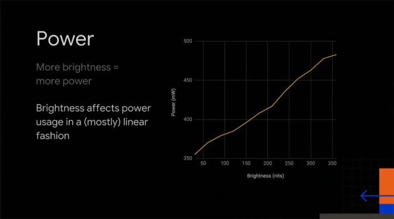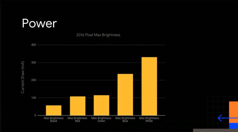 La misma diapositiva también mostró la ridícula cantidad de consumo de energía del color blanco. En el escenario, Google incluso reconoció el hecho de que el blanco es «menos que ideal».